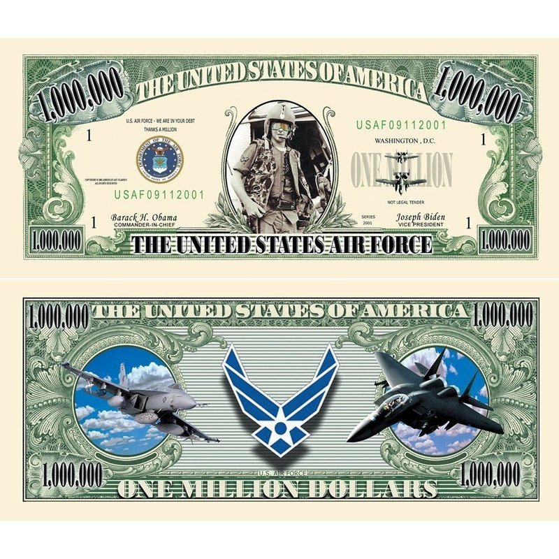5 US Air Force Commemorative Million Dollar Bills with Bonus “Thanks a Million” Gift Card Set
