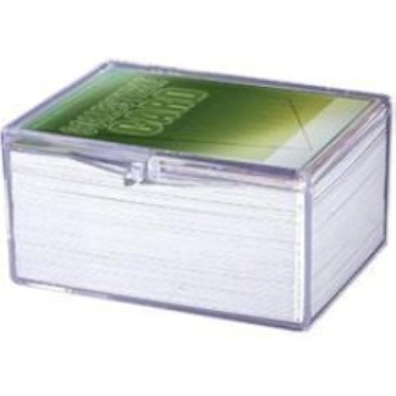 Basic clear / transparent plastic case that holds up to 100 standard sized cards -Archival safe fits standard sized sports and gaming cards -Hinges on one side & 'Snap-lock' piece to keep lid closed (mcfg:100h/cs)