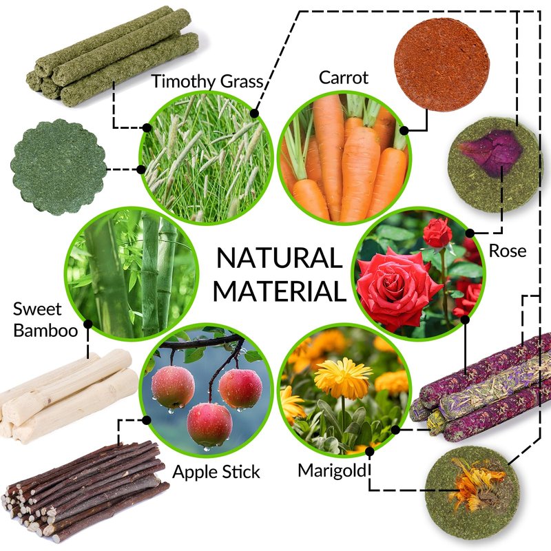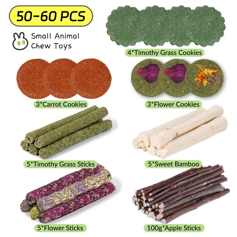 - 【50-60 Pcs Rabbit Chew Toys】50-60 Pcs rabbit chew toys set includes 5*Sweet Bamboo, 5*Timothy Grass Sticks, 4*Timothy Grass Cookies, 3*Carrot Cookies, 5*Flower Sticks, 3*Flower Cookies, 100g*Apple Sticks.