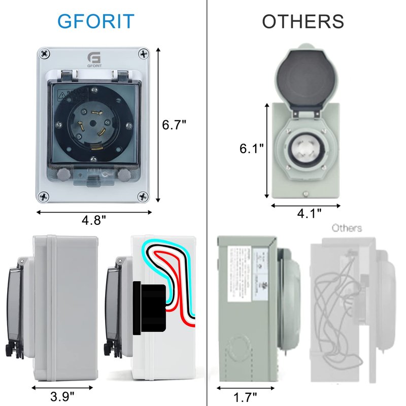 - Weatherproof & Anty-rust: the whole body of GFORIT generator power inlet box is made of heavy duty ABS plastic, with powerful features such as wind, rain and rust! In addition, it adopts a flip design (with tighten screw and waterproof gasket), also could be closed when not in use, which is dedicated to preventing dust and humid air; it can provide the best protection in any bad weather!