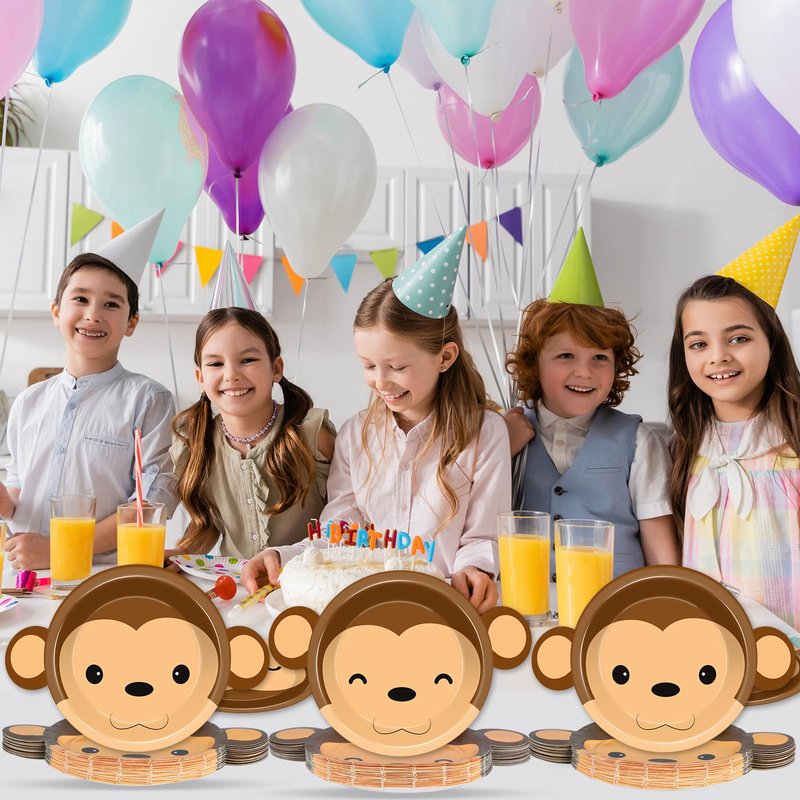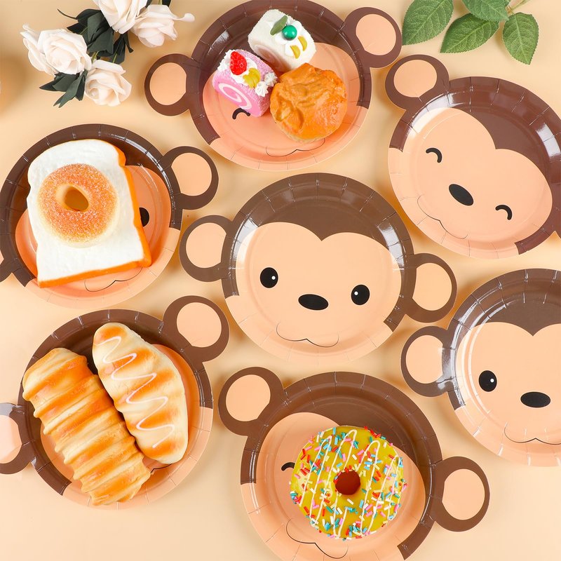 the paper plates feature unique and cute monkey shapes, which will be the highlight of the party table and create a good jungle safari animal theme party.