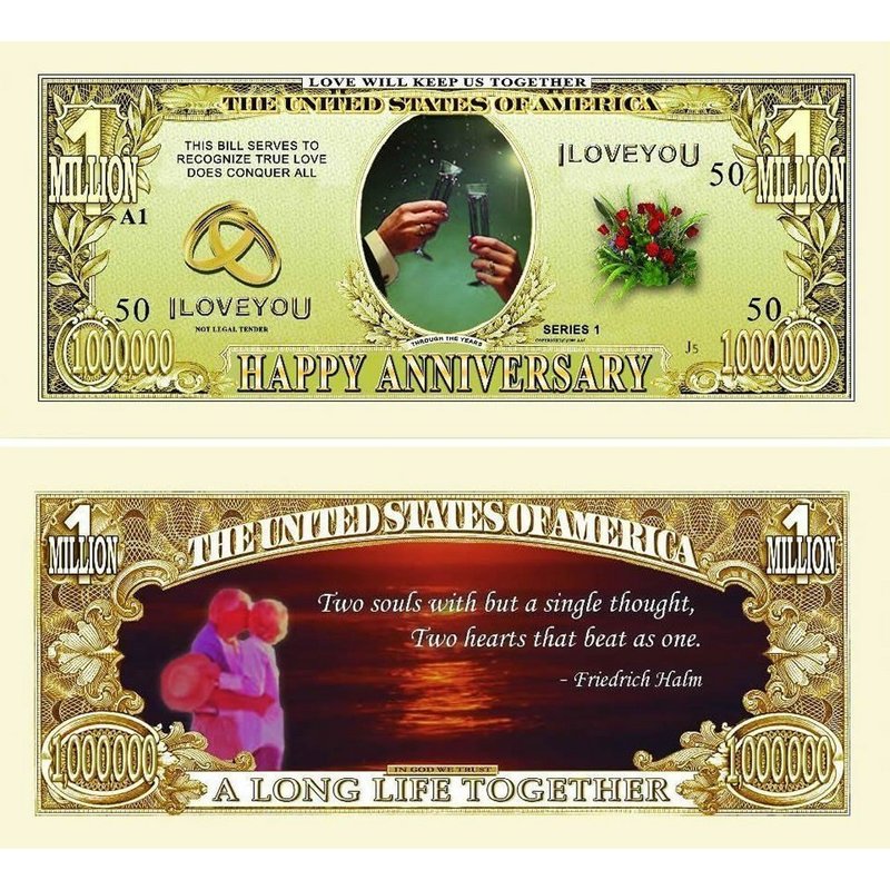 50 Happy Anniversary Million Dollar Bills with Bonus “Thanks a Million” Gift Card Set