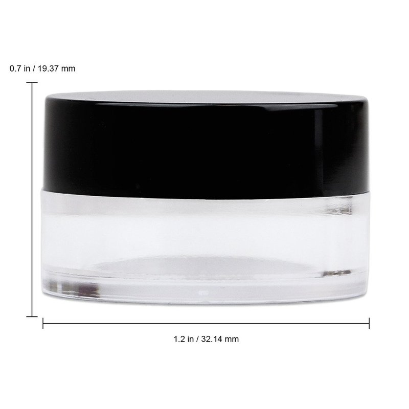 - Size- 5G(5ML) l Color: Black (Clear Jar Black Lid) l Quantity: 50 PCS l Dimensions: Outer: 1.2 Inches x 0.7 Inches Inner: 1 Inches Diameter