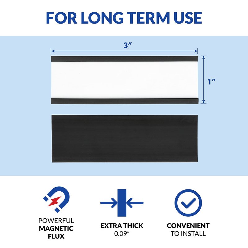 - Everything You Need for 50 Strong Magnet Backed Labels: Designate and organize! Use as drawer and shelf label holders, bookshelf and file cabinet labels and more! The clear label protectors keep your labels crisp and clean.