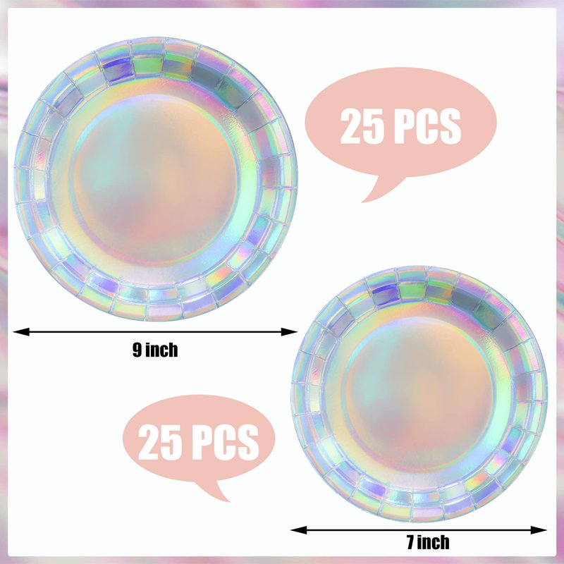 - 7in &9in: holographic paper plates have two dimensions: 7 inches and 9 inches, which can be applied for lunch, dinner, dessert and appetizer, or as the charger plate; the shiny plates can hold sandwiches, tacos, salads, soups, cupcakes as well as treats.