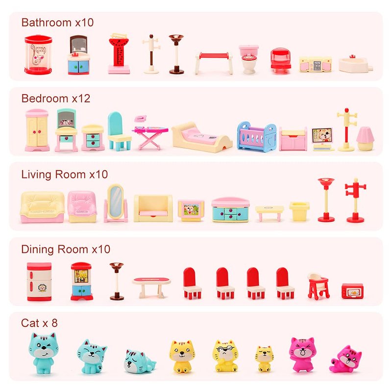 - 3. 50 pieces of rich accessories, portable and easy to store. warm scenes, interesting and true. simulate family life through these toys so that children are full of imagination, curiosity and practical ability.
