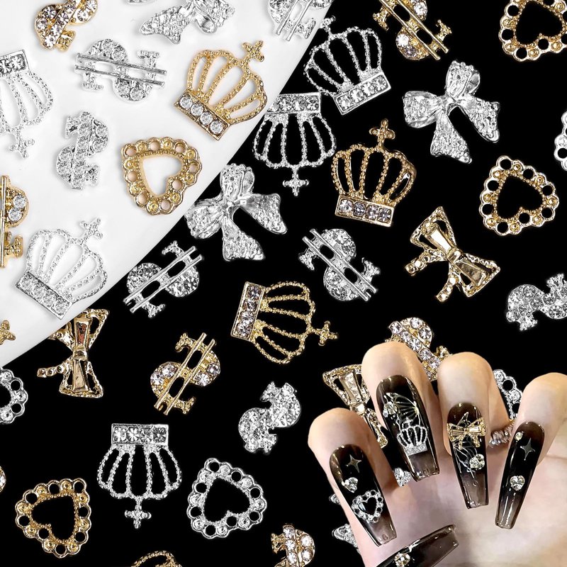 - Rich Styles Nail Gems: These are 10 styles nail gems of shapes, like silver gold bows charms for nails, crowns nail charms, heart nail charms and dollars nail charms gems. You can have a lots design nails art and make them shine and eye-catching