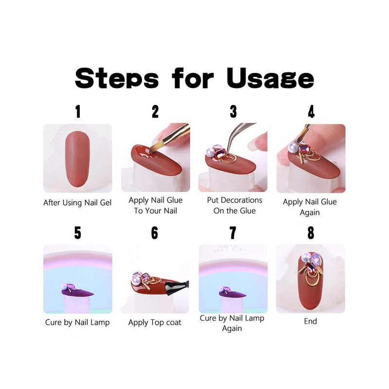 - Simple to Use: Apply a few drops of nail glue on the finished manicure and paste it onto your nails with tweezers. To make nail art more shiny and lasting, you can apply more glue around the sides or apply a top coat on the surface.