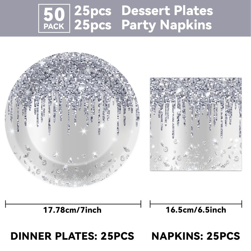 - Package includes: This silver dessert tableware set contains 25 pcs 7inch glitter diamonds silver themed plates and 25 pcs 6.5inch diamonds silver themed napkins, ample quantity to satisfy party needs.