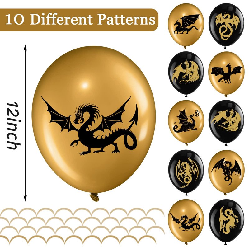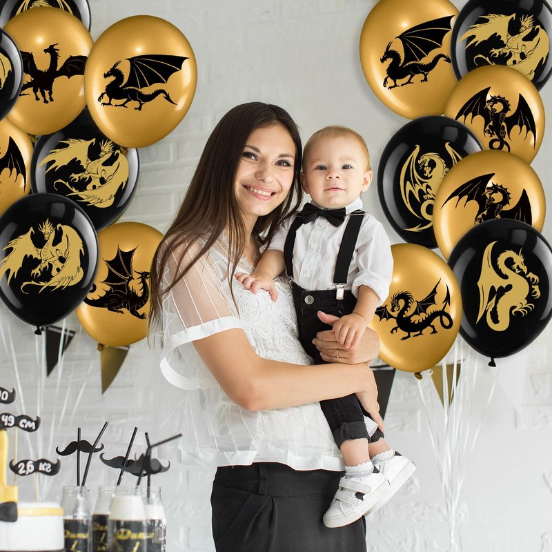- Dragon Party Balloons: prepare a dragon themed birthday party for your kids this summer;This black and gold dragon party balloons set will be a cute addition to your home, wall, hall, roof, rooms, doorways, porch and so on