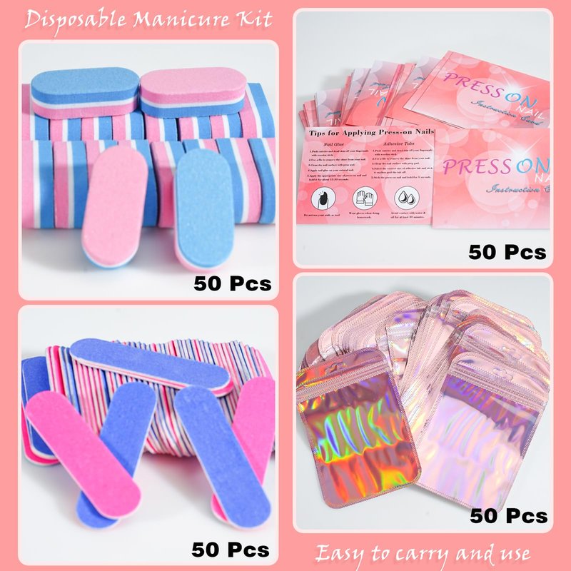- 【Package Includes】You will get 50 set of disposable manicure kits(totally 400pcs), including 50pcs Mini nail file,50pcs nail buffer,50pcs adhesive tabs,50pcs 2g nail glue,50pcs wood sticks,50pcs prep pads,50pcs pink holographic bags,50pcs instruction cards