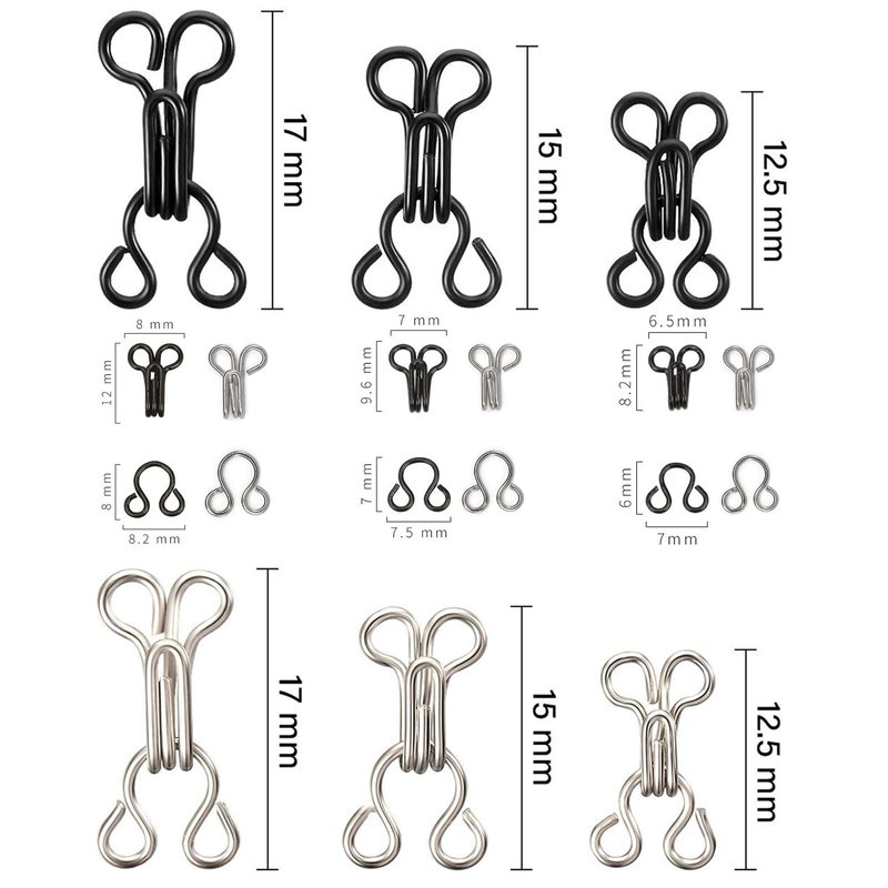 Including large, medium, small 3 different sizes; The small hook and eye together is 12.5 mm in length, the medium hook and eye together is 15 mm in length, and the large hook and eye together is 17 mm in length. In additional, each color has 3 sizes.