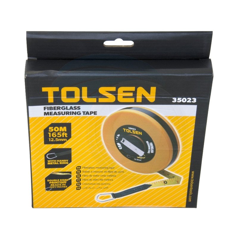 Tolsen metric and imperial 50meter/165feet long measuring tape has 12.5mm wide fiberglass blade and 2 color graduations. It's easy to read in all conditions. The high-impact, high visibility yellow ABS case helps to store and fold the product for storage.