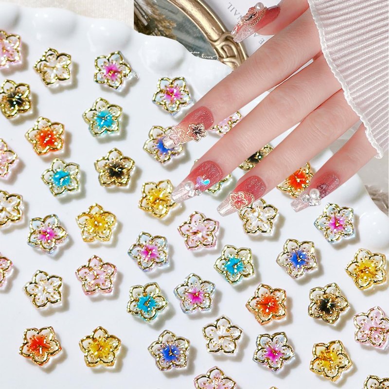 50Pcs Flower Nail Charms 3D Lovely Flower Charms Nail Rhinestones Gold Edge Glaze Design Resin Nail Jewels Colorful Floral Nail Art Charms Supplies Cherry Blossom Petals Nail Gems for Acrylic Nails