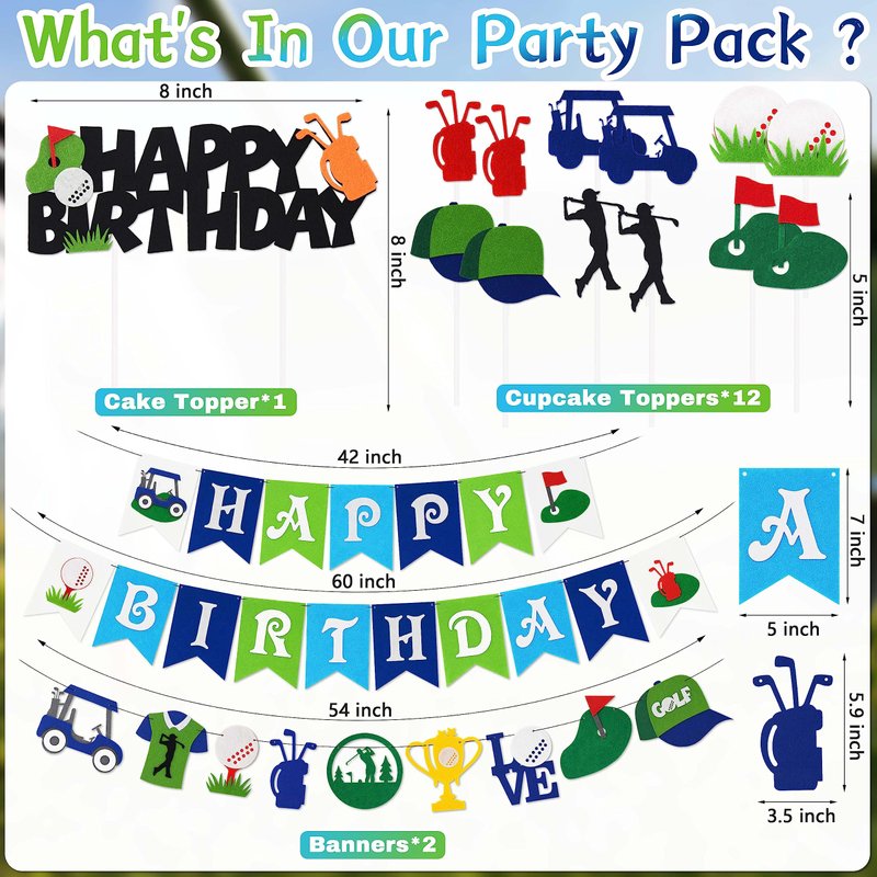 - 【High Quality】: The golf balloon set is made of high-quality aluminum foil materials and adopts natural printing technology, non-toxic and harmless. The banner and cake topper are made of felt, safe and durable.