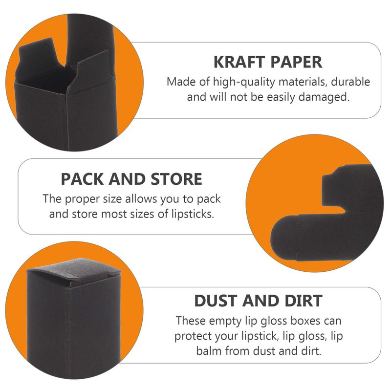 Description 50 kraft paper boxes. convenient for you to carry and replace. This box can be folded and can be removed for storage when not in use, making your life more convenient. Suitable for sample packaging of lipstick, lipstick/ lip gloss, essential oil, skin cream, perfume, small , makeup and cosmetics.Features- Material: Kraft paper.- Color: Black.- Size: 2x8. 5cm.Package Including 50 x Packaging Boxes