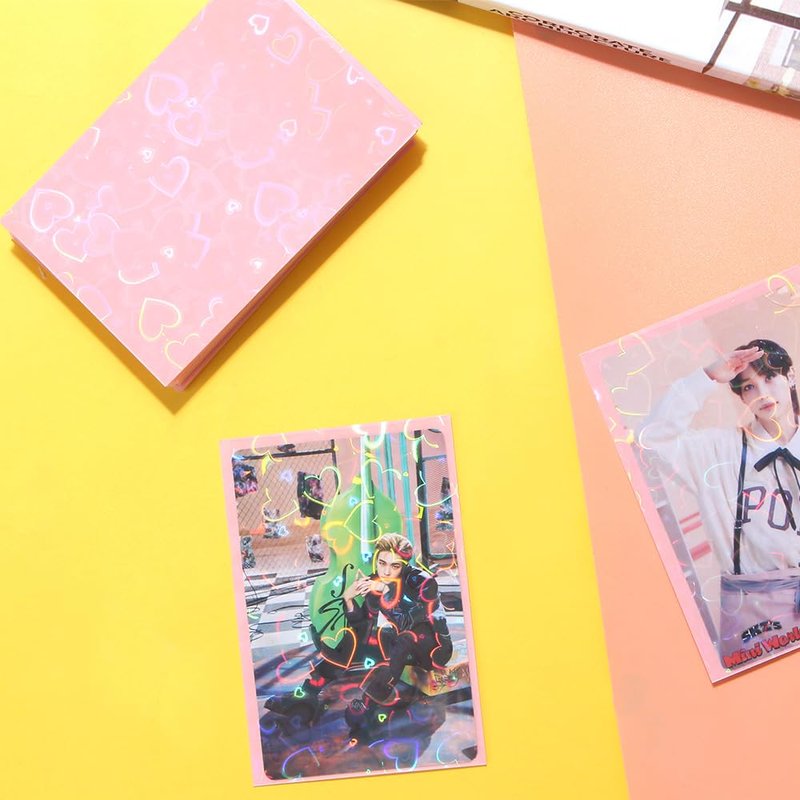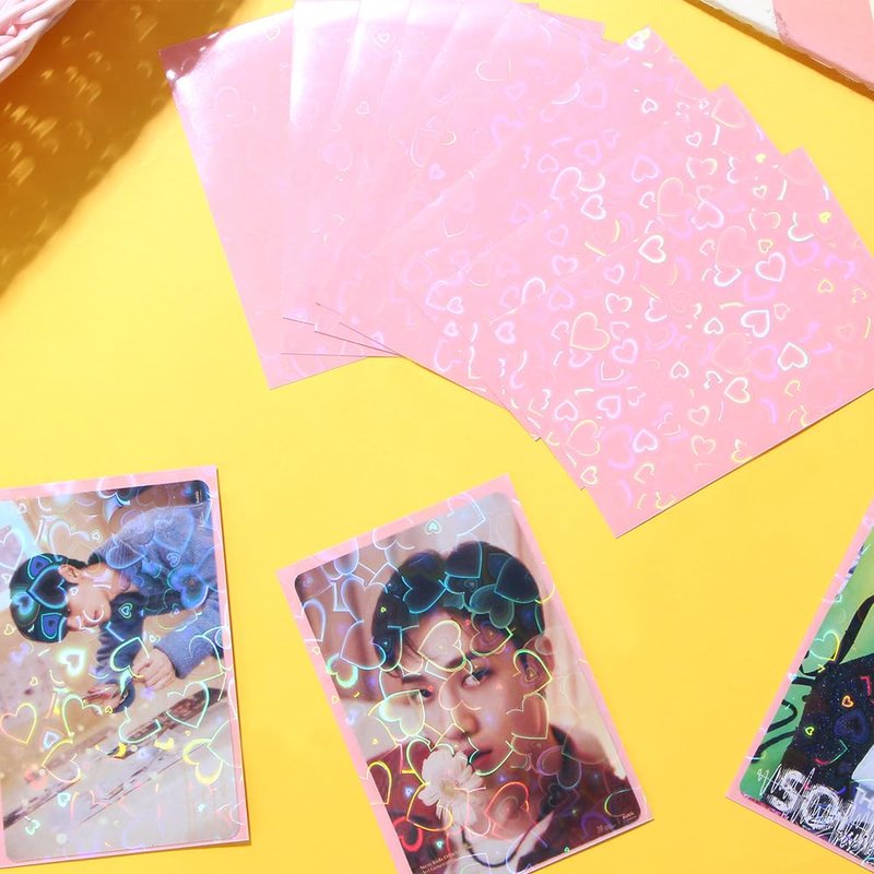 - [Exquisite Design]: This card protector has a one side adopts laser style with a heart pattern and transparent design, which glitters and glitters under the lights, allowing you to distinguish different cards. With a candy color design on the back, which makes these photo card sleeves more beautiful and delicate.