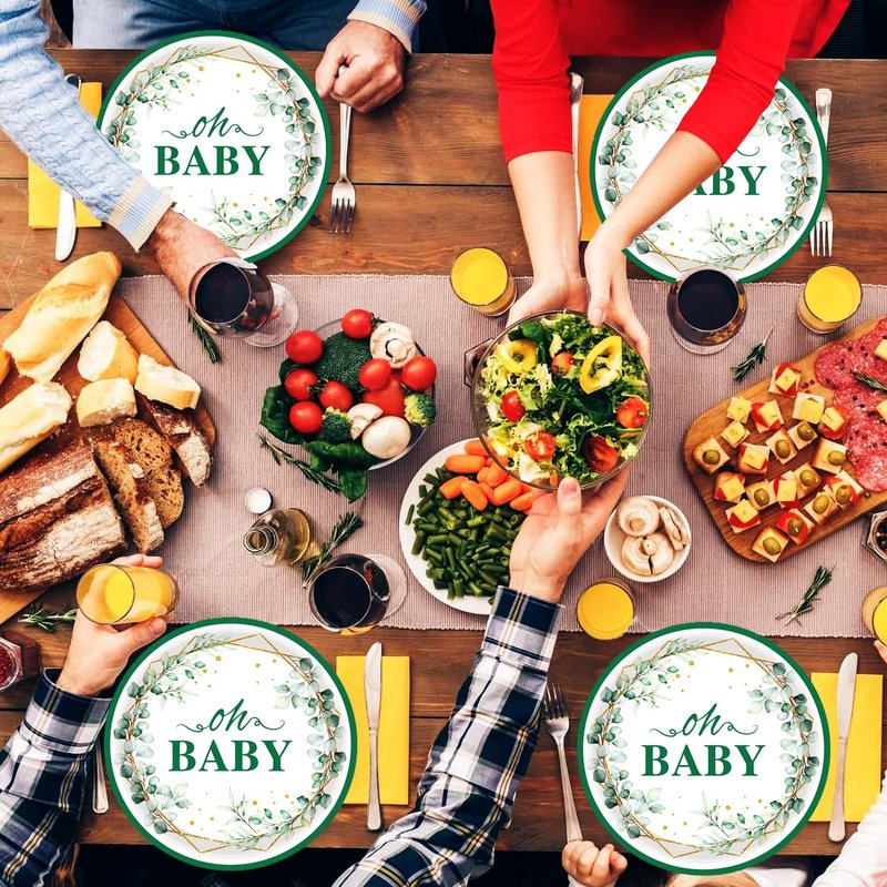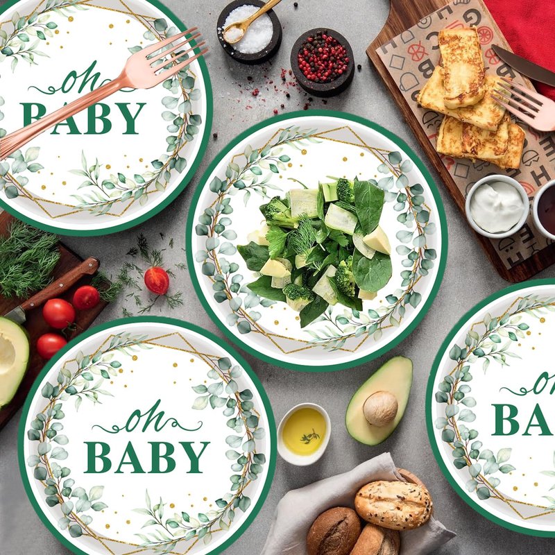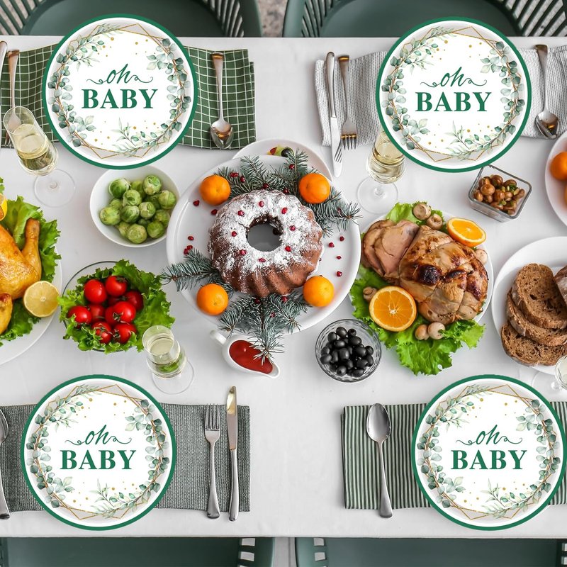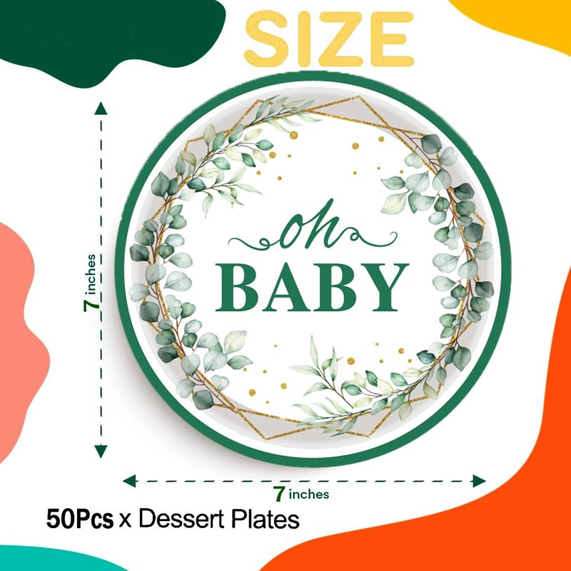 The package includes: 7"Oh baby eucalyptus plates dessert plates X 50pcs, DIMENSIONS:Plates are measure 7 inches in diameter. High-quality materials:All our Oh baby-themed tableware are made of high-quality paper,non-toxic,tasteless,heat-resistant and durable.The patterns and colors are well-printed and do not fade,providing you with a party full of Oh baby themed atmosphere. QUICK AND EASY CLEAN UP:These Oh baby party decorations can save clean up,When you're done with the tableware,just throw away the food scraps along with the tableware,save your time,just spend motime enjoying your partyre ! Satisfied Experience:This party supplies pack is designed to oh baby party pattern.Adding an elegant,fancy touch to any party.Feel free to contact us if the products don't meet your expectations.