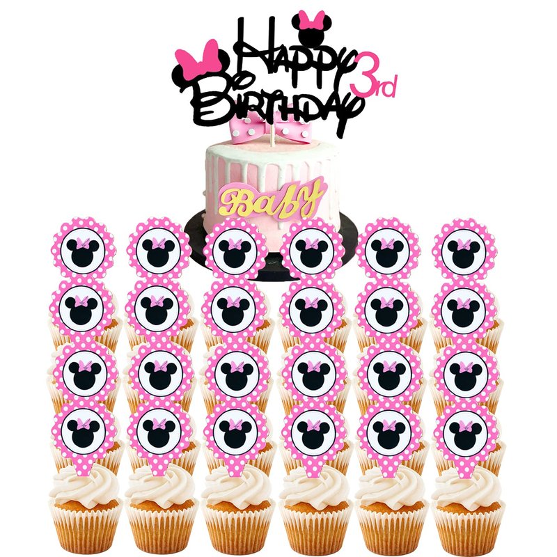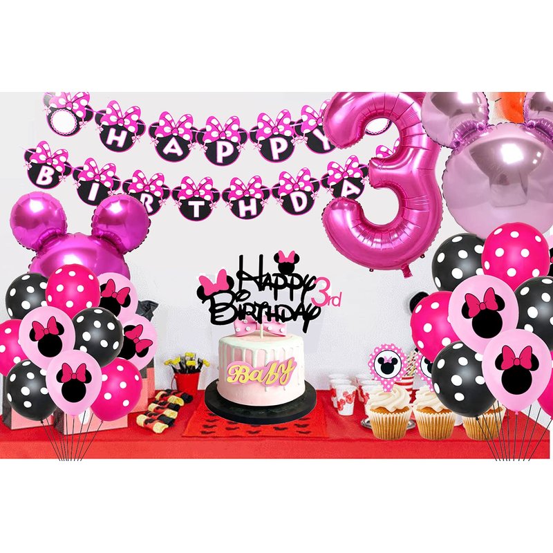 - PACKAGE INCLUDE:1pc pink mouse happy birthday banner,2pcs 24in mouse head foil balloons,1pc headband balloon,1pc number 3 balloon,20pcs 12in latex balloons,1pc pink mouse 3rd birthday cake topper and 24pcs cupcake toppers.