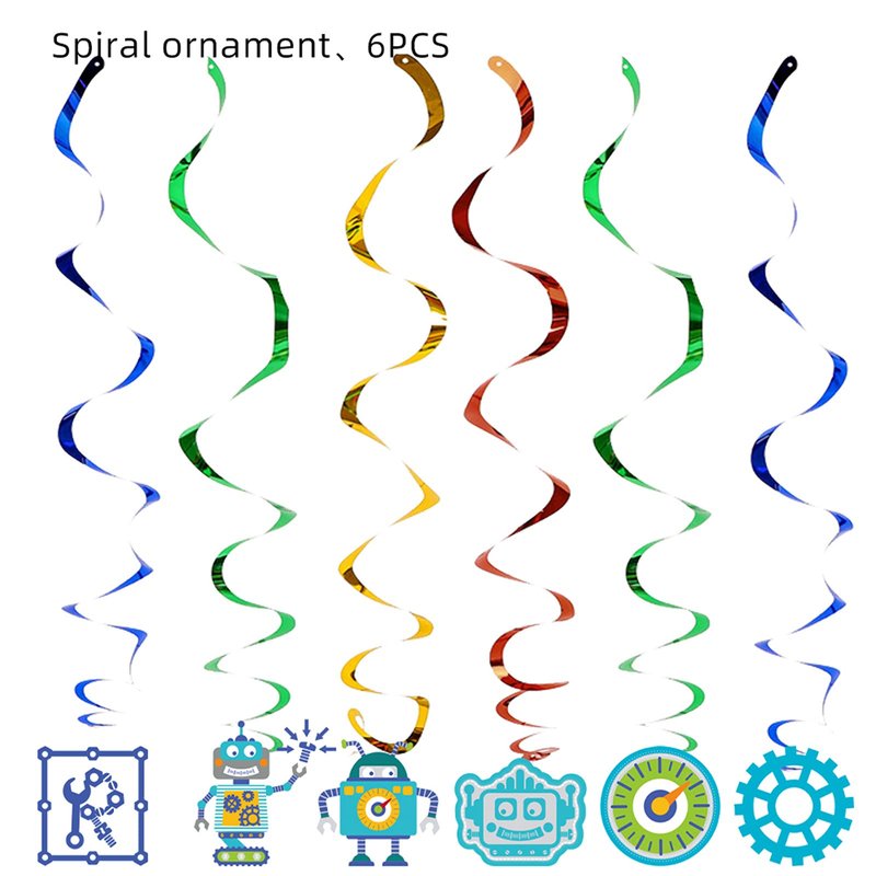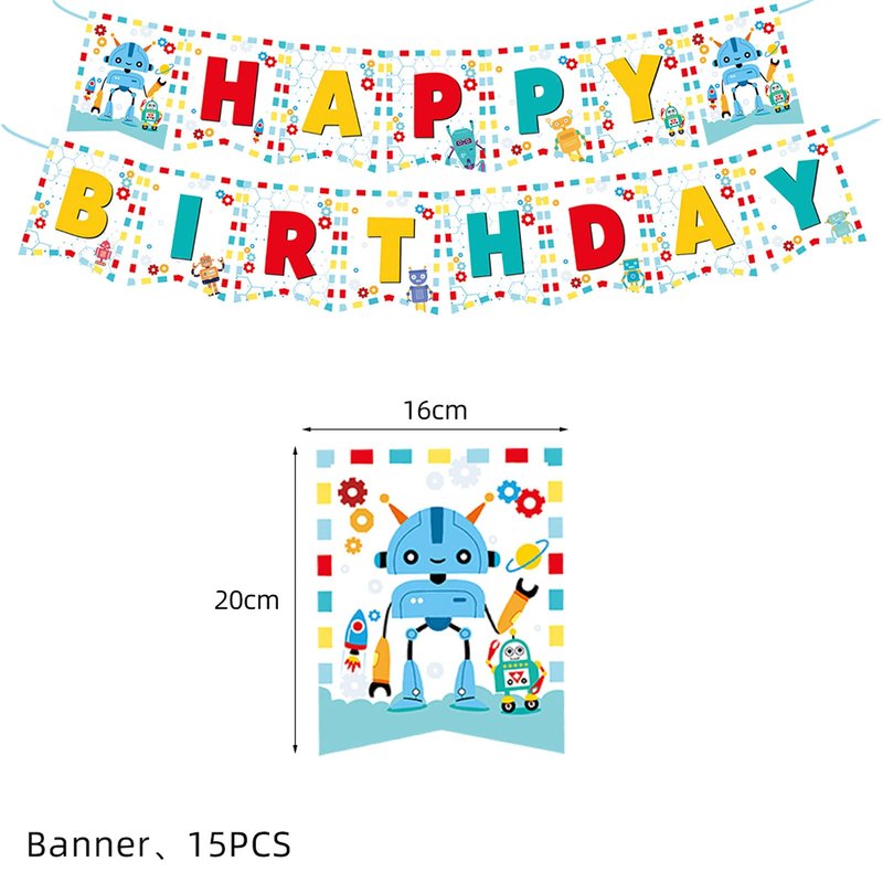 - Robot Party Supplies:1Pcs Robot Happy Birthday Banner,1Pcs Cake Topper,24Pcs Cupcake Toppers,6Pcs Spiral Ornaments,18Pcs Latex balloons.Total in 50 pieces.