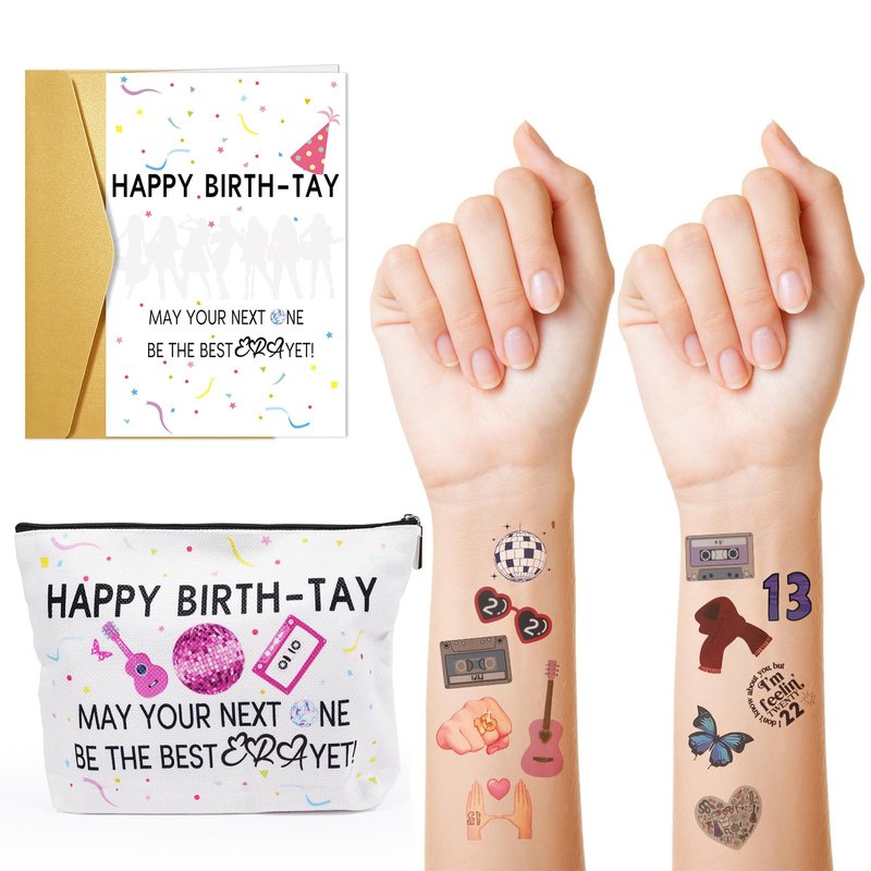 50PCS Temporary Tattoos Gift with Funny Birthday Card and Cosmetic Bag Merch Set, Music Birthday Party Decorations for Fans, Great Sweet Birthday Gifts for WOmen Girls