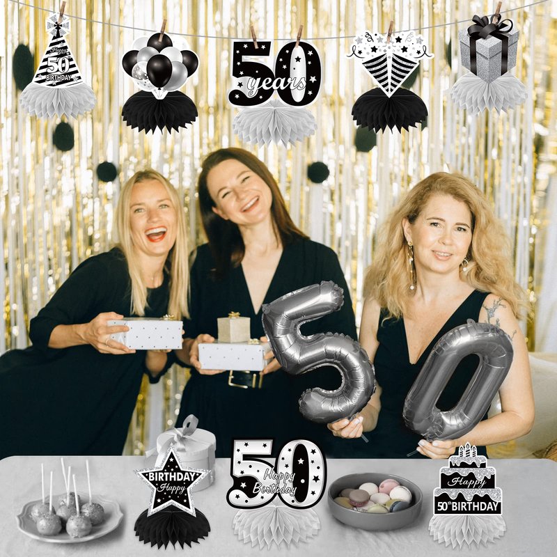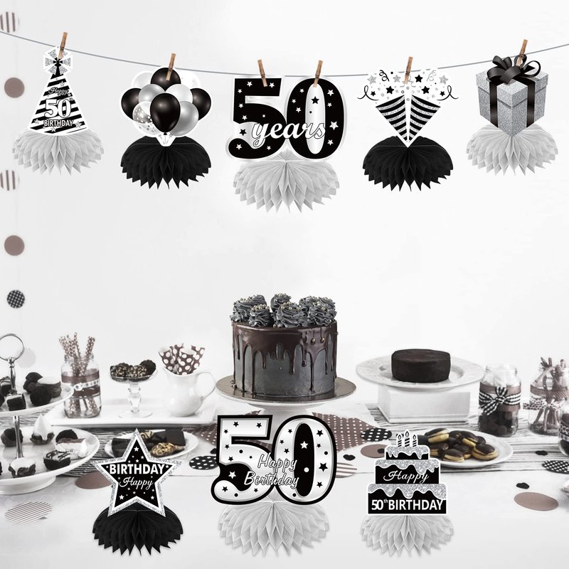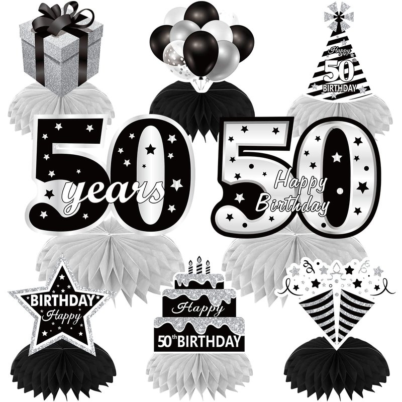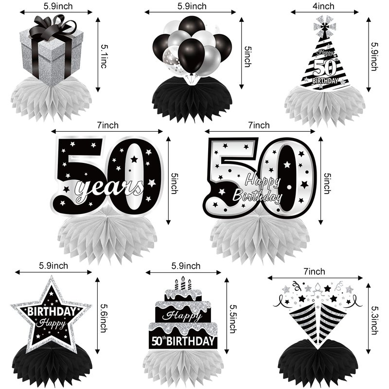 - [You will get] - 8 Pcs Black White and Silver 50th Birthday Honeycomb Centerpieces Decorations, including 8 pieces of 50th Birthday theme pattern cardboard, 8 paper honeycomb (5 silver and 3 black), enough to decorate your birthday party.