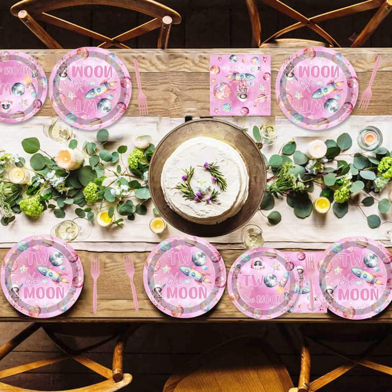 51 Pcs Outer Space Girls 2nd Birthday Party Supplies Two The Moon Birthday Decorations Tableware Includes Table Cloth, Plates, Napkins, Forks for Pink Space Two Years Old Birthday Party Decorations