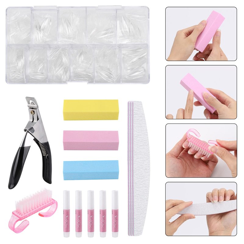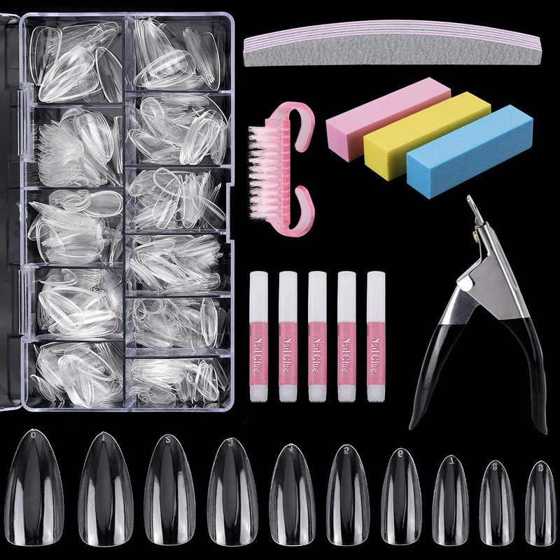 - GREAT VALUE NAIL KIT: 500pcs almond nails/box(10 sizes) + 5pcs nail glues + black nail clipper + pink dust brush + 3pcs grit nail files + 3pcs sponge nail files