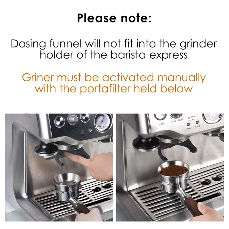 IMPORTANT NOTE: When using machines such as the Breville Barista Express, the portafilter holder (used to hold the portafilter when dosing/grinding) cannot be used while the funnel is installed.