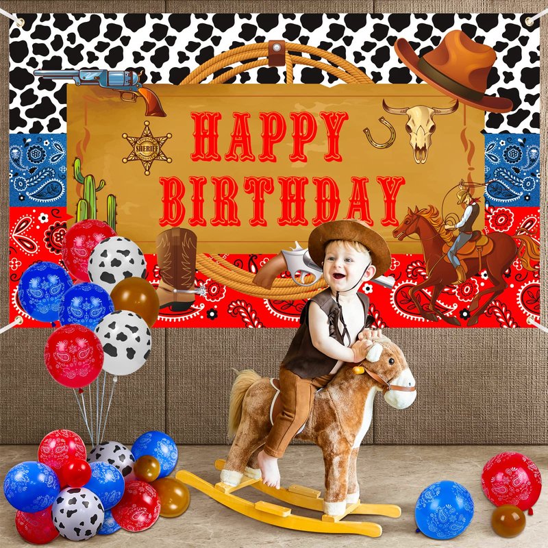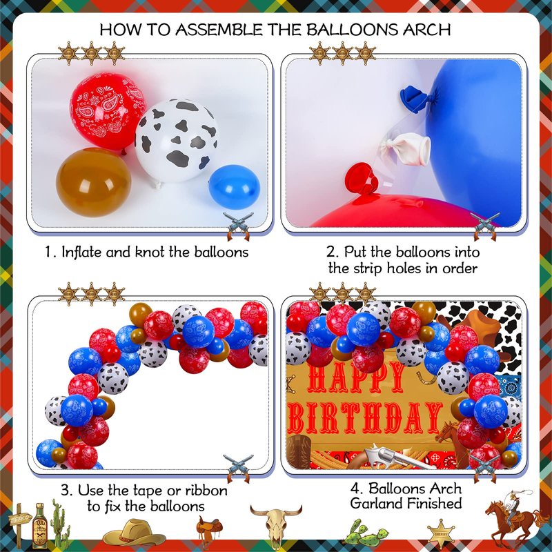 - š[Easy to assemble]- the cowboy happy birthday banner can be hung with a rope, without assembling. Besides, just inflate the balloons and fix them with the strip chain and dot tape. you can fix the balloons on the wall, entryway for party decoration, or other places you'd like to decorate
