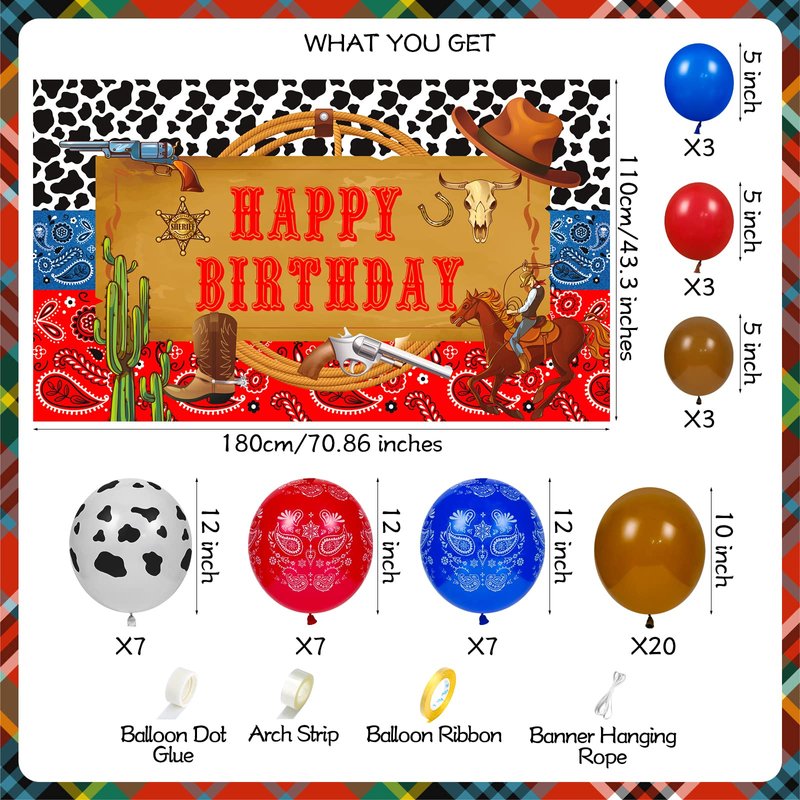 - š[Quality Materials]- The balloons are made of quality latex, non-toxic, and not easy to break. Besides, the west cowboy happy birthday backdrop is made of durable polyester, which is lightweight, foldable, and washable. it can be reused for a long time