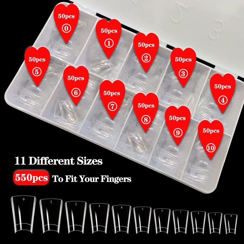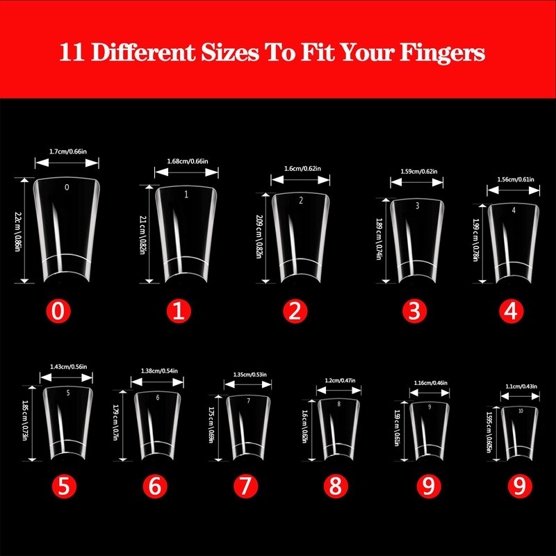 - 【11 Sizes Flare Duck Nail Tips】Dudjndjd 550PCS clear duck nail tips in box contain 11 varied sizes to fits for most finger. 50 tips for each size, each transparent duck nails press on has the pre-number 0-11 individually in well-organized storage case for you to distinguish easily and reserve. Enough quantity can satisfy your home DIY or nail salon needs.