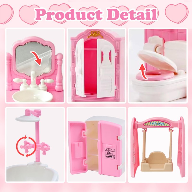 Kids always like pretend play and this dollhouse furniture accessories set will provide tons of pieces for imaginative exploration. Your doll can really sit on the sofa to watch TV, and at the dining table Eat, take a bath in the bathroom, and play on the swing. These dollhouse furniture come with a wide range of accessories, allowing you to enjoy playing house anywhere.