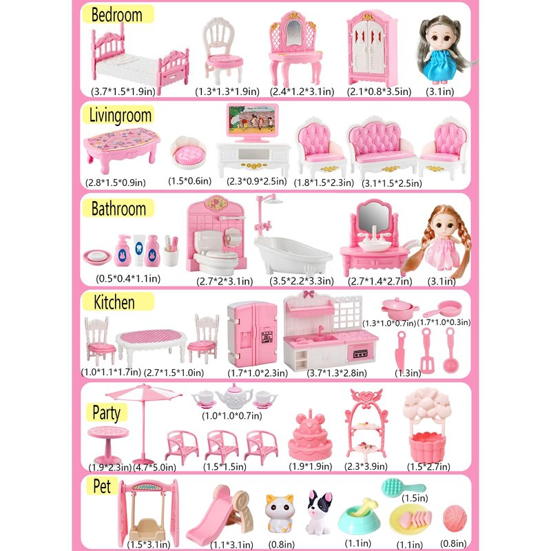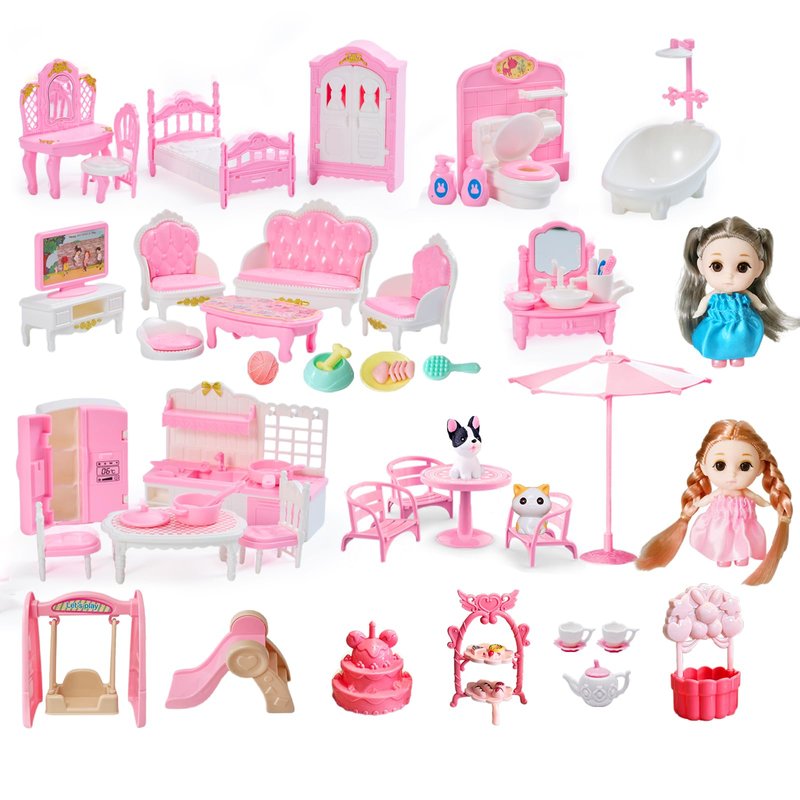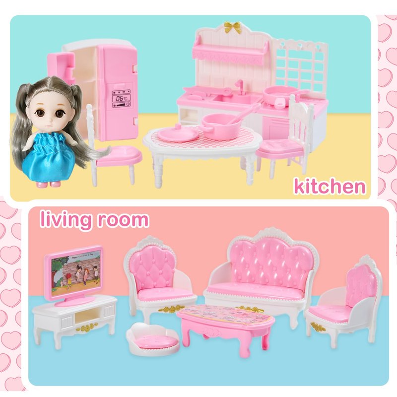 You will get the bedroom, bathroom, living room, kitchen, swing, pet, afternoon tea accessories, every mini toy house toy set containing rich accessories from the doll house suit. Children can use this toys house furniture to decorate their own micro toy houses and create their dreams.