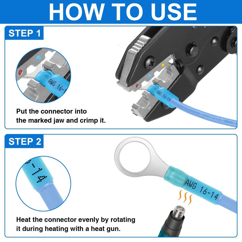 For best results, please choose the right connector, use a hot air gun, heat evenly until connector reduces in size and the adhesive flows, filling gaps within the terminals.
