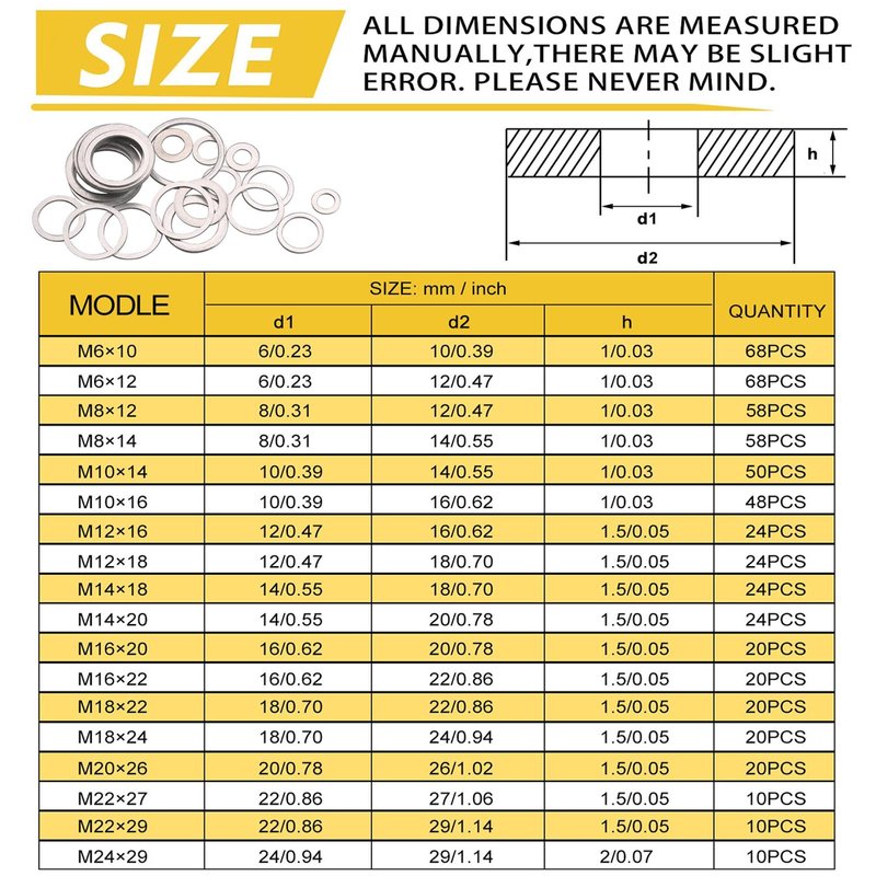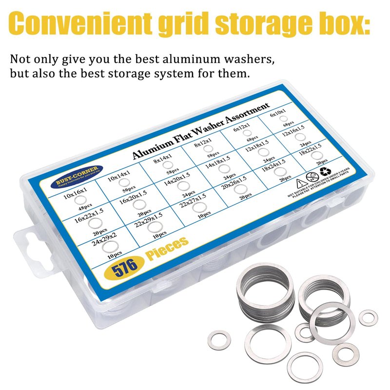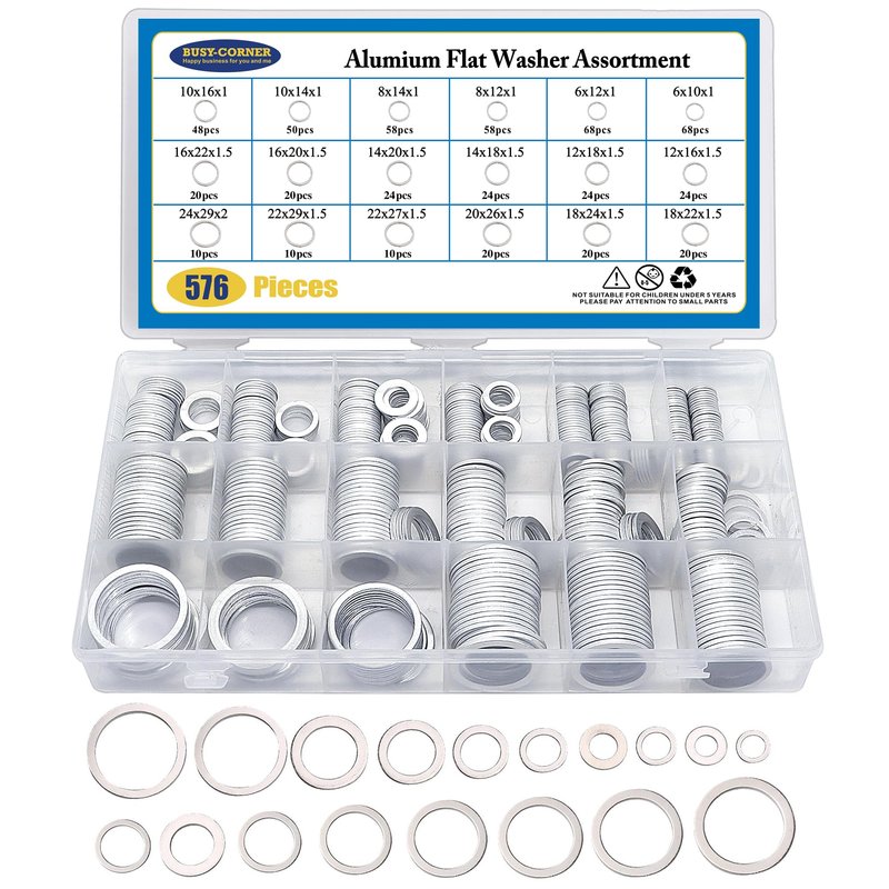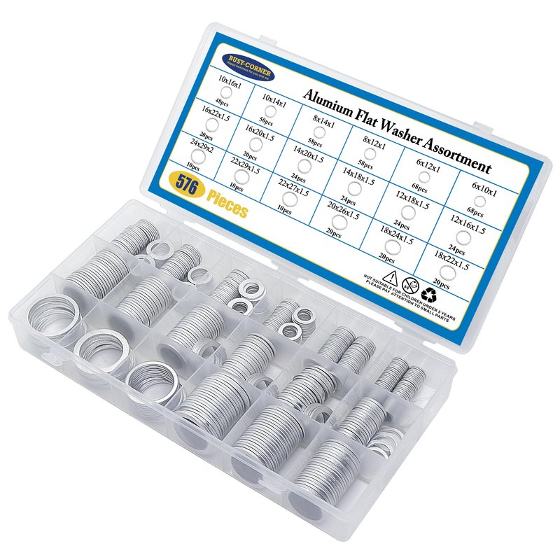 - ✔【VARIOUS SIZES】Aluminum Washers that comes in 18 Sizes: M6 M8 M10 M12 M14 M16 M18 M22 M24. Each box contains a total of 576 different washers for your infinite amount of use.