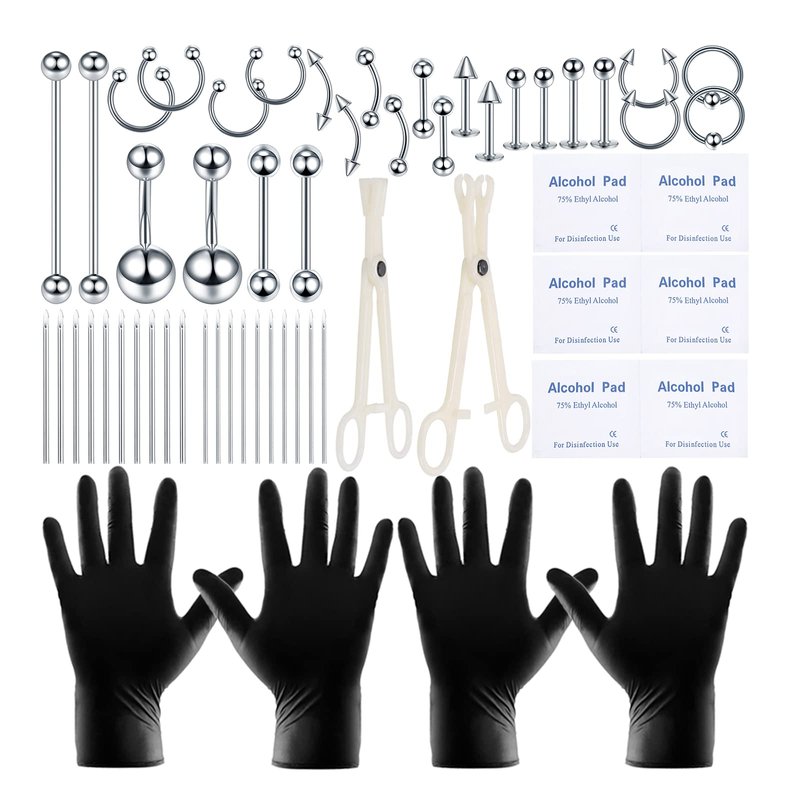 58PCS Body Piercing Kit Surgical Steel 14G 16G BCR CBR Labret Lip Rings Cartilage Daith Earrings Belly Button Rings Nose Septum Piercing Jewelry Needles Gloves Clamps Tools