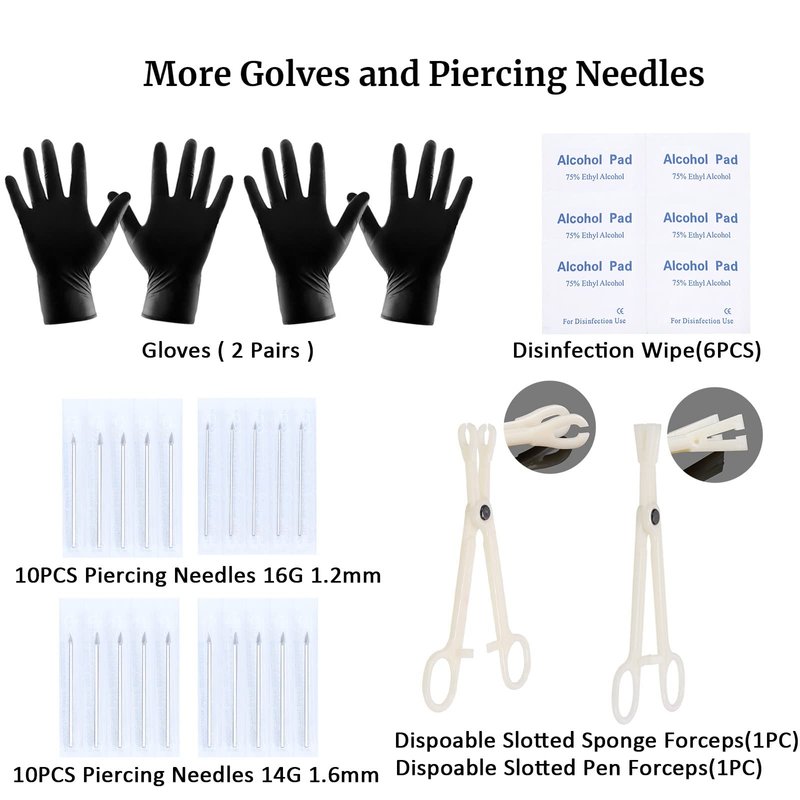 - 【 MORE Gloves and Needles 】 Piercing Tools Contains MORE Gloves and Needles . 4PCS Black Latex Gloves + 10PCS 14G Piercing Needles + 10PCS 16G Piercing Needles + 2PCS Disposable Piercing Clamps + 6PCS Alcohol Pads.