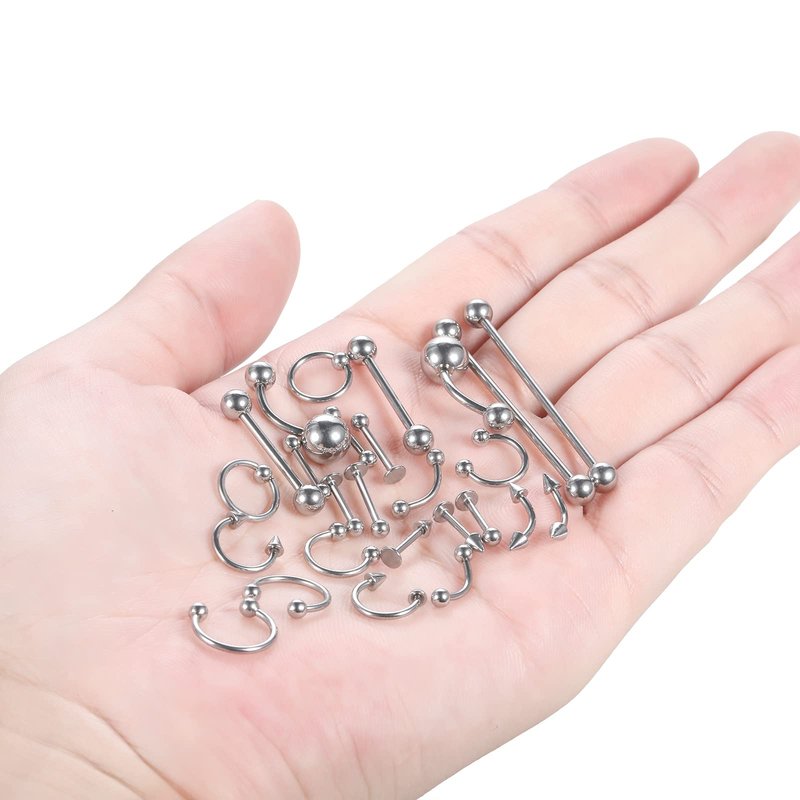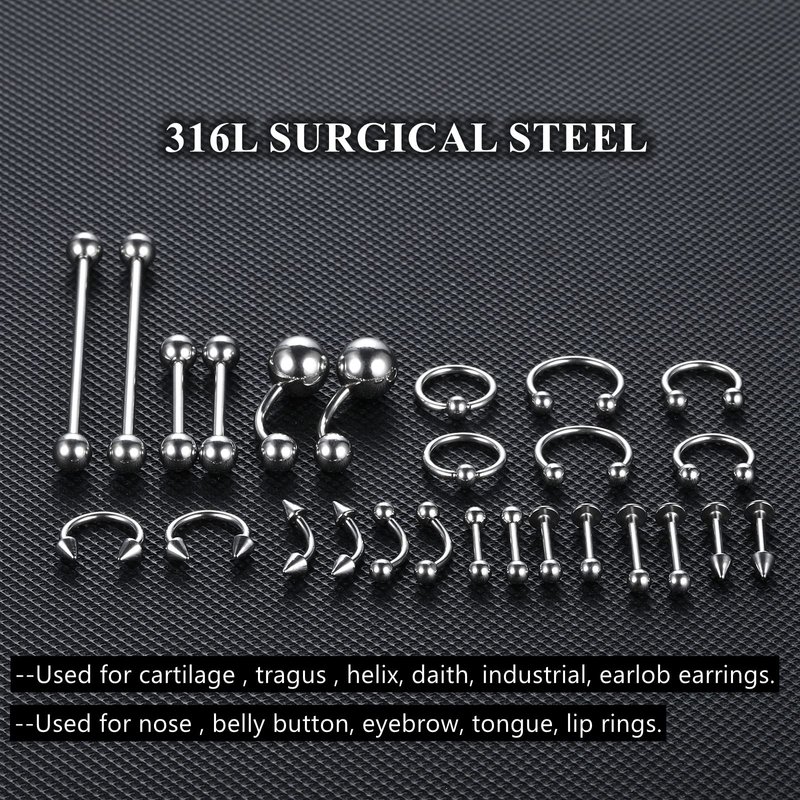 - 【 Piercing Jewelry 】 2PCS Ball Closure Rings (CBR) 16G + 6PCS Horseshoe Barbells Rings (BCR) 16G + 6PCS Labret Studs Rings 16G + 4PCS Eyebrow Rings (Curved Barbells) 16G + 2PCS Tragus Earrings 16G + 2PCS Tongue Rings 14G + 2PCS Belly Button Rings 14G + 2PCS Industrial Barbells 14G .
