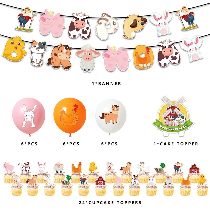Bring the fun of the farm to your little one's birthday celebration with this 58-piece Farm Animal Party Decoration Kit! Packed with charming details, this all-inclusive set will transform any space into a delightful barnyard bash that kids and adults alike will adore. The star of the show is the vibrant "Happy Birthday" banner, featuring lovable farm animal characters that instantly set the playful tone. Adorable cow, pig, and chicken cupcake toppers add an irresistible touch of whimsy to sweet treats. The matching farm animal cake topper steals the show as the centerpiece on the birthday cake. But the fun doesn't stop there! This kit also includes a dozen farm-themed balloons in cheerful shades of red, yellow, and green to decorate the party space with a festive, down-on-the-farm atmosphere. Made with premium quality materials for long-lasting durability, this party decoration kit takes the stress out of planning. With every detail covered, you can sit back and enjoy your child's special day as they bask in the delightful farm animal theme. Don't miss out on this adorable and affordable party essential!