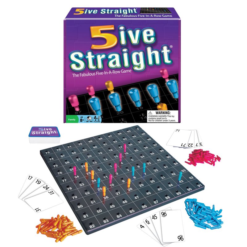 Our Winning Moves version of the classic board game 5ive Straight. This version has the two piece plastic game board, three sets (42 pegs per set) of colored pegs and a deck of 100 cards (numbered 0-99). Manufactured by 5ive Straight Products, Inc. This version of the 5ive Straight Board Game is sure to be in your game collection for years to come.
