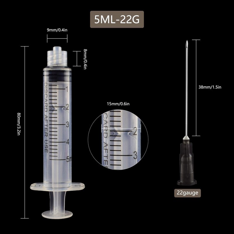 - This pack contains 20 pack 5ml syringe with 22G 1.5 inch needle ,each individually wrapped