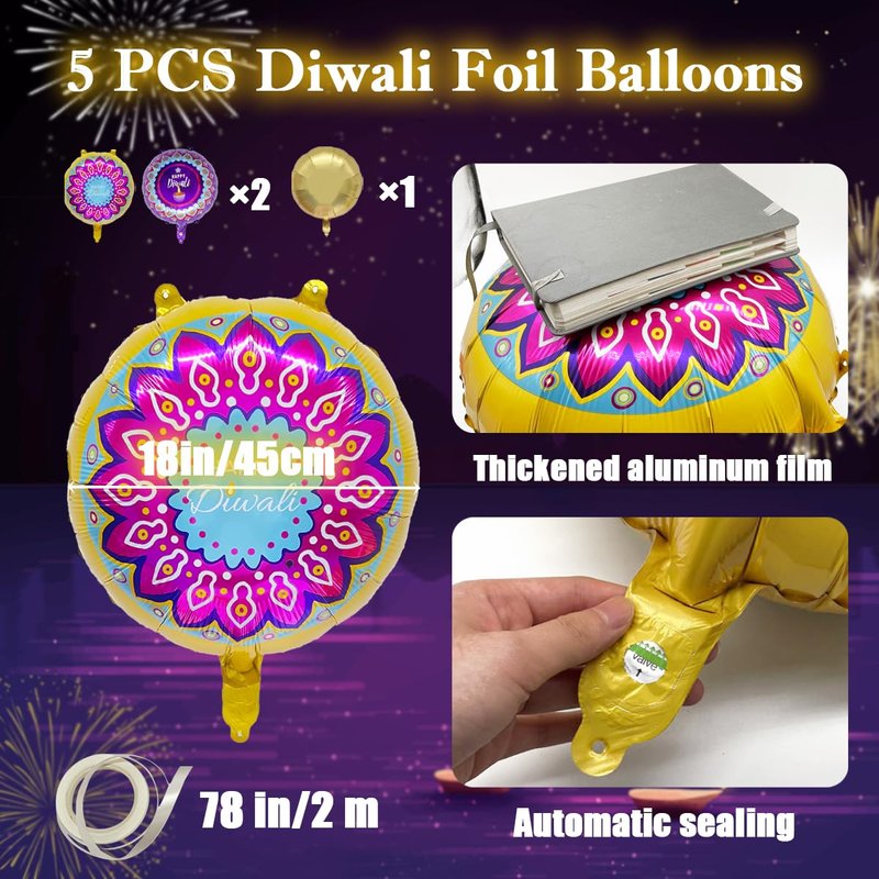 - Diwali Decorations Balloon set: the package contains 5 Diwali aluminum balloons and 1 roll of 78in/2m white ribbon, 1 straw, the diameter of the balloons after inflation is about 18 in/45 cm, the balloons are decorated with Diwali festive atmosphere