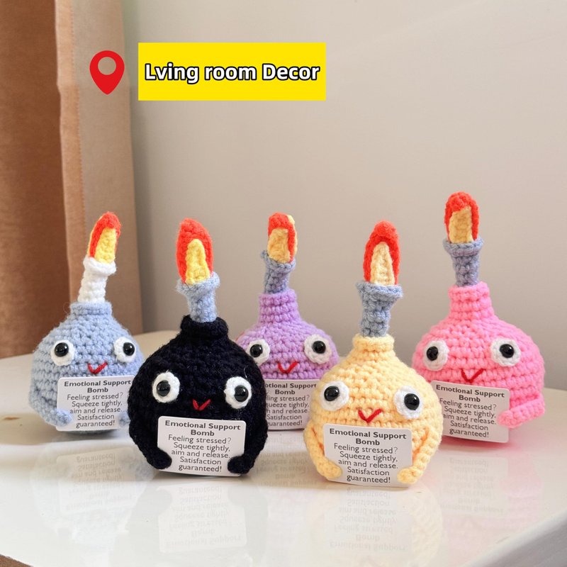 5PCS Handmade Crochet Bomb Desk Ornament Introducing the 5PCS Handmade Crochet Bomb Desk Ornament set! These delightful crochet F-bombs are not just quirky desk accessories; they serve as emotional support companions designed to lighten the mood and provide stress relief. Perfect for your home or office, these charming ornaments make thoughtful gifts for colleagues, friends, or anyone in need of a little humor and comfort. Specifications: Material: 100% acrylic yarn, filled with soft polyester fiber Dimensions: Each bomb measures approximately 2.3 inches in diameter,4.7inches tall Weight: Lightweight and easy to display Color Options: Available in various vibrant colors to match different tastes Care Instructions: Spot clean with a damp cloth; do not machine wash Usage Suggestions: Desk Decor: Place them on your desk to add a fun and whimsical touch to your workspace. Stress Relief Tool: Squeeze them during stressful moments to help alleviate tension and bring a smile to your face. Gift for Colleagues: Perfect for office gifting, these bombs can serve as a humorous yet supportive gesture for team members. Home Accent: Use them as playful decor in your living room or bedroom to brighten up your space. Conversation Starters: These quirky ornaments can spark fun discussions and lighten the mood in any setting.