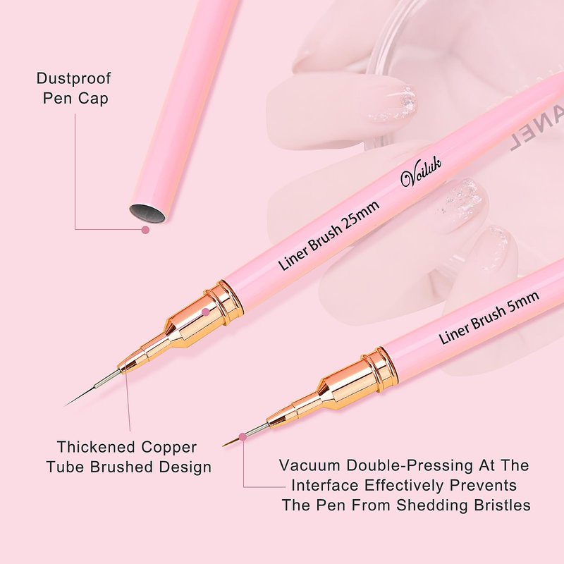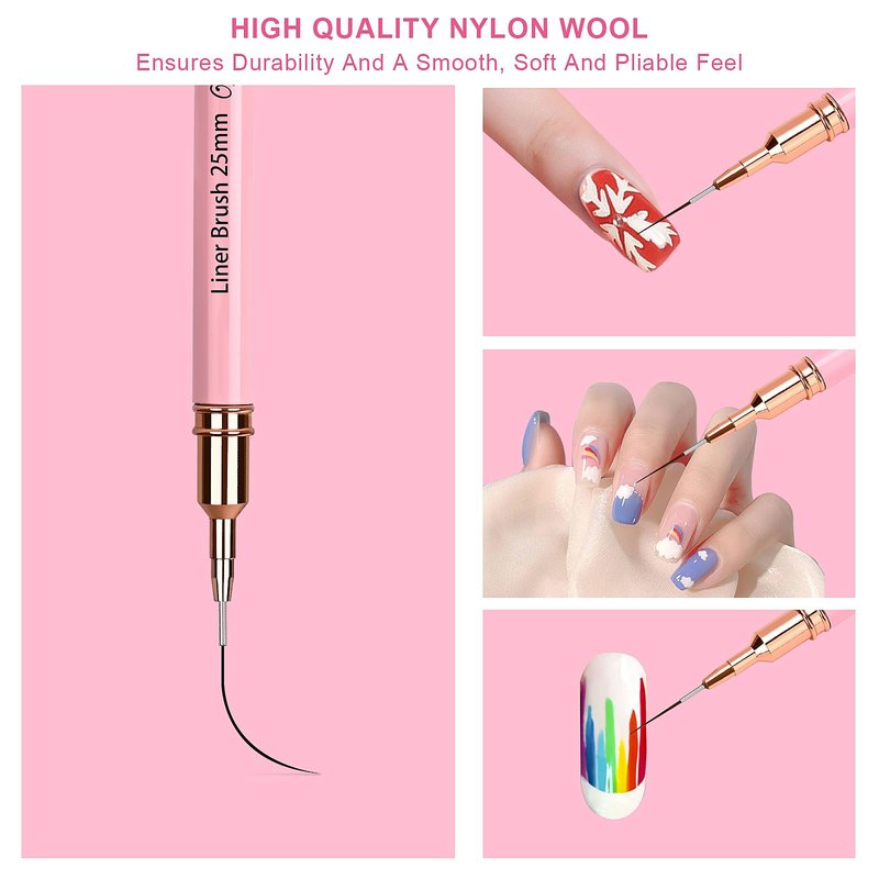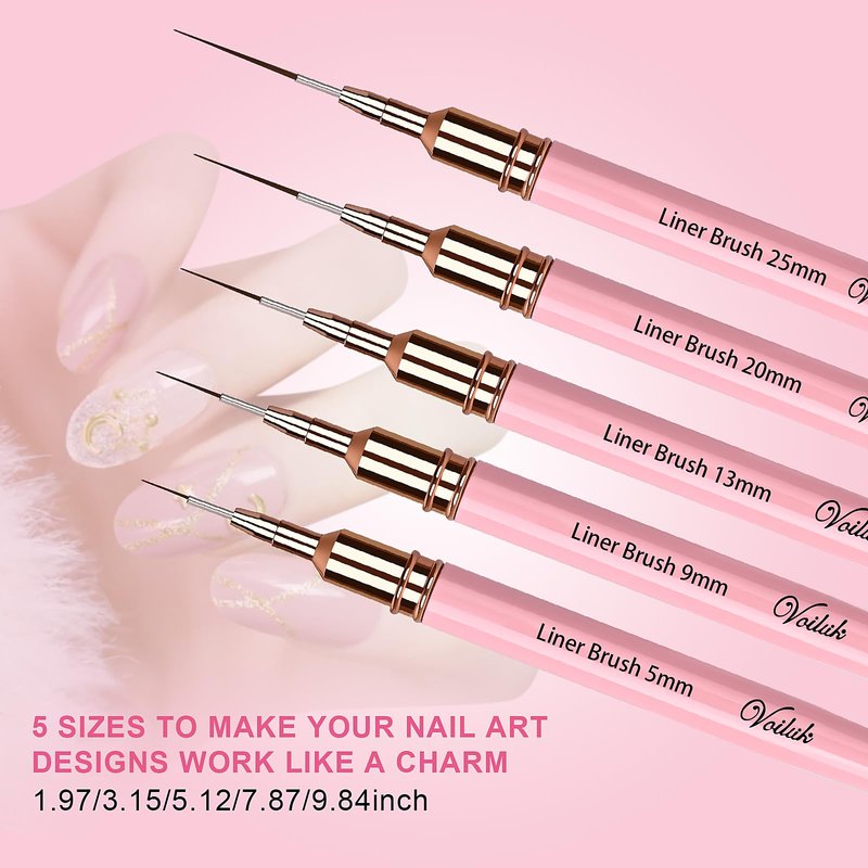 - 1.【PROFESSIONAL GRADE NAIL ART LINE BRUSHES】: High Quality Detail Brushes Made Of Premium Nylon, Each Process Uses The Most Stringent Quality Testing Of Its Peers To Ensure Durability And Smooth, Soft And Pliable Feel, 5 Different Sizes Of Bristles Can Draw Different Long Lines, Short Lines, Straight Lines Or Curves, And Can Be Used For Different Nail Art Paintings, Such As French Tip Paintings, Flowers, Chevron Patterns, And Gradient Designs Gel Nail Polish Or Gel Paint.