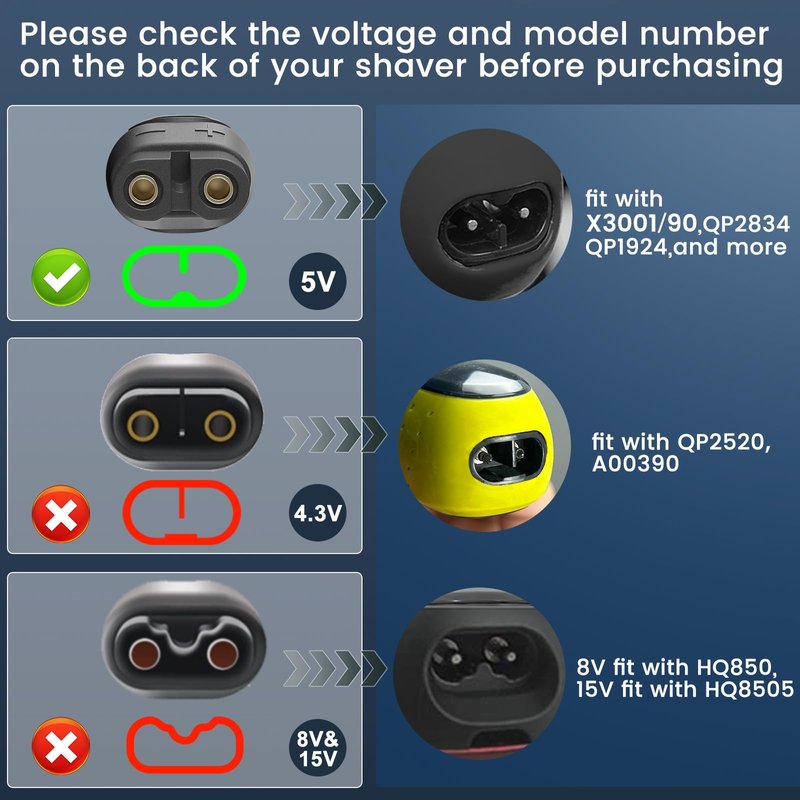 - for Philips Norelco Shaver Charger Cable: Fit for Philips norelco shaver S3341/92(3900) X3001/90(2400) S3243/91(3600) X5006/85 MG9520/50 MG7910/49 MG9510/60 MG5910/49 QP2724/90 QP2834/70 QP1924/70 QP6531/70, for philips rechargeable wet & dry electric shaver (Not Applicable to Old Versions)