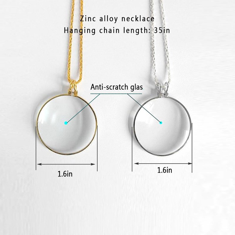 - Magnifying glass necklace is effective in its simplicity and is an essential tool for reading fine print on magazines, receipts, examining documents, photographs and collectibles. With magnification power to make letters appear about 5x bigger than normal. Magnifier loupe great as a gift, halloween costuming, cosplays, and theater plays.