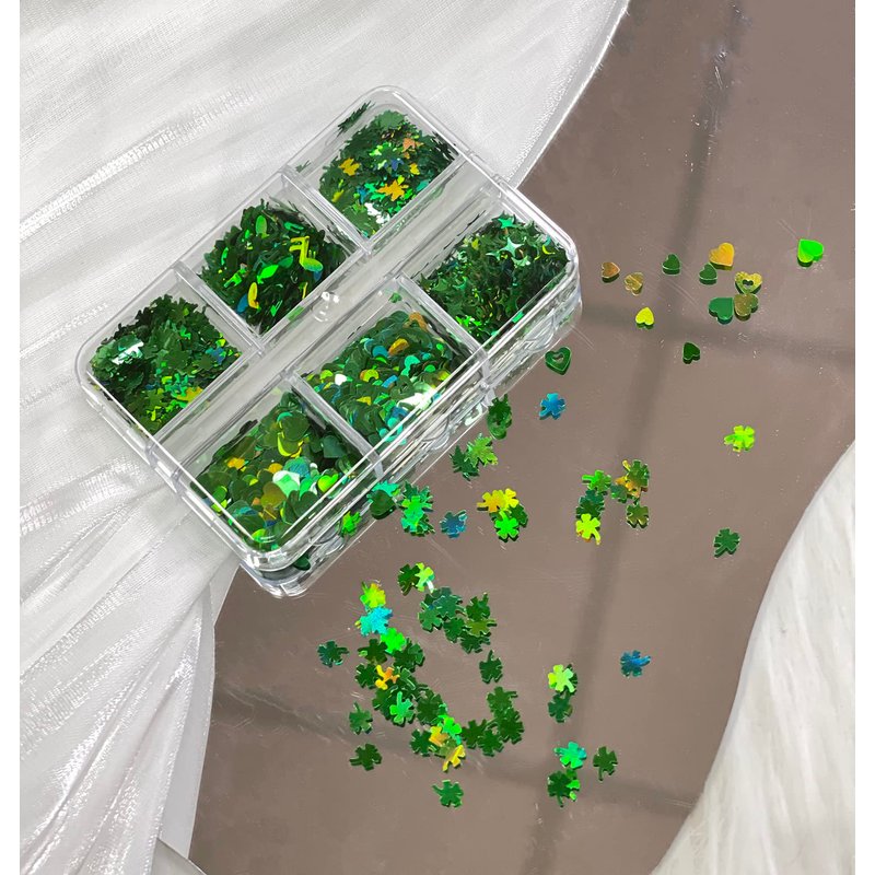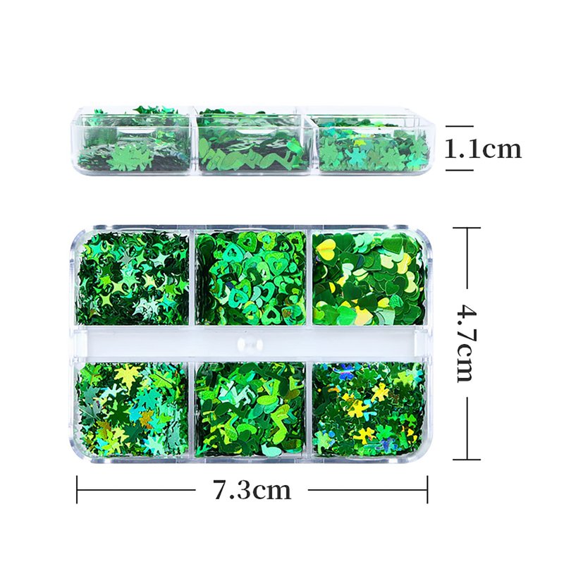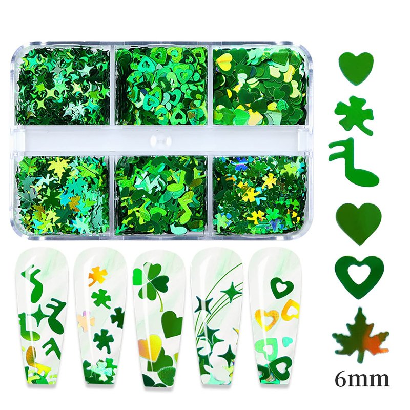 6 Grids 3D Heart Nail Glitter Sequins St. Patrick's Day Nail Art Stickers Decals Green Clover Flakes Acrylic Nails Design Supply Nail Sparkle Glitter for Nail Art Decoration