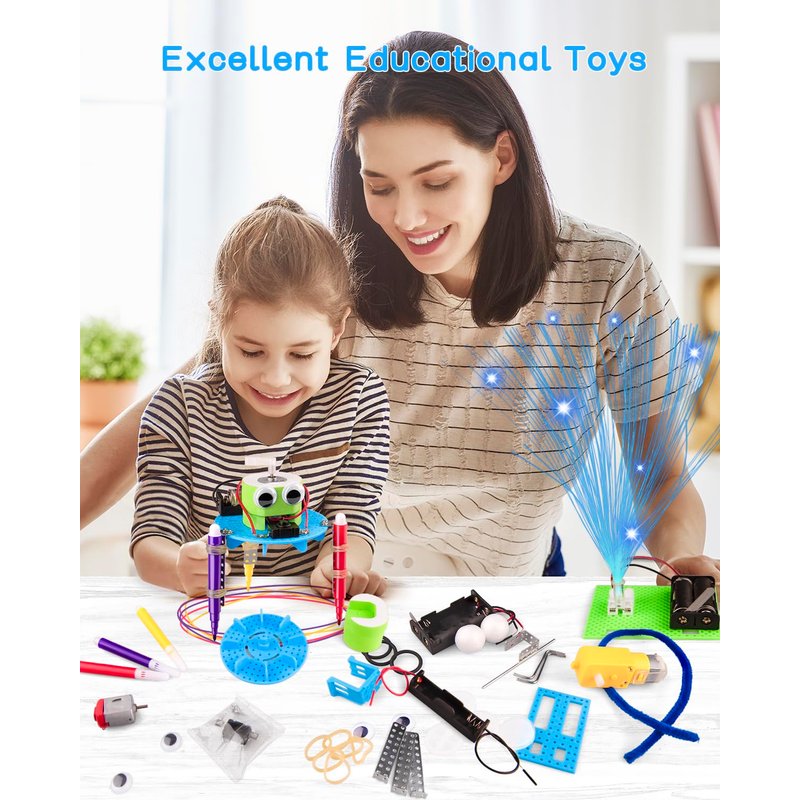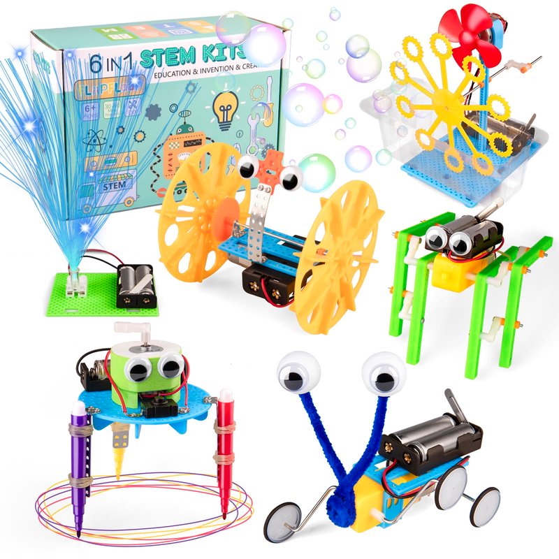 - 6-in-1 STEM Kit for Kids: This set includes 6 exciting projects—Hand-Cranked Bubble Machine, Multicolor Fiber Optic Lamp, Doodle Robot, Eight-legged Robot, Crawling Robot, Balancing Robot — all designed to inspire creativity and teach essential STEM skills. Perfect for kids aged 6+ to explore engineering, robotics, and renewable energy.