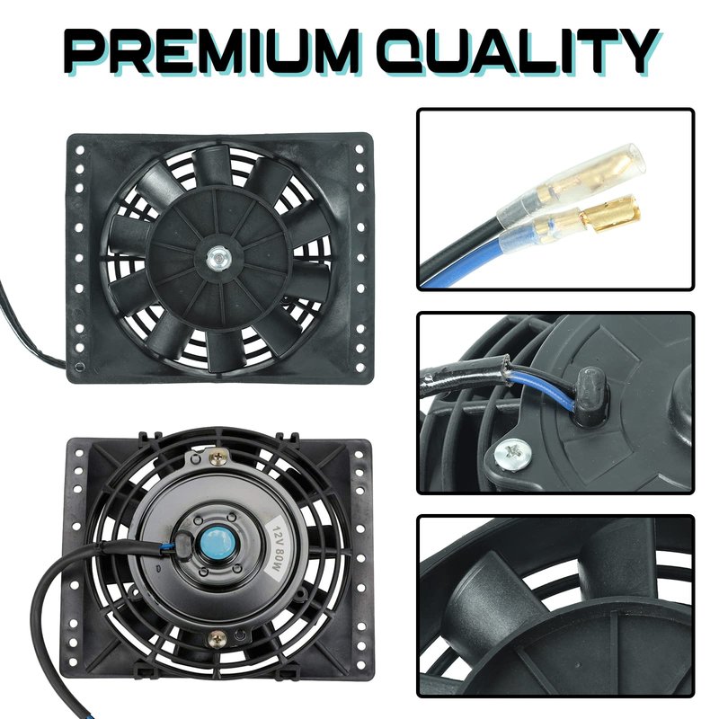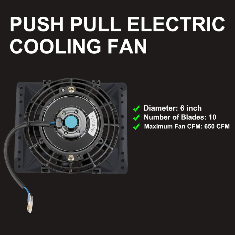 - 【6'' Radiator Cooling Fan】6 Inch radiator cooling fan with mount brackets and tie straps kit.Voltage: DC 12V, Watts: 80W, Maximum Fan RPM: 2250RPM,Maximum Fan CFM: 650 CFM.
